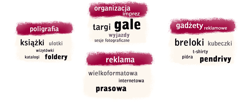 Mamy przyjemność zaproponować Państwu współpracę z młodym i dynamicznym zespołem. Cechuje nas kreatywność, umiejętność dostosowania się do potrzeb klienta, krótkie terminy realizacji, atrakcyjne ceny i dążenie do perfekcji. Wykonujemy prace kompleksowo: kreacja, przygotowanie do druku, druk, organizacja materiałów do wysyłki oraz transport.